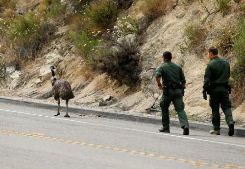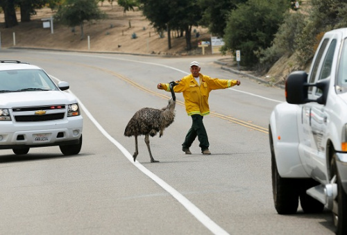 请走人行道!鸸鹋冲上高速路 巡警耐心劝离(组图)