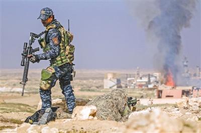 图为伊拉克政府军士兵参加攻打摩苏尔机场行动。