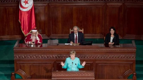 默克尔在讲话中还称赞突尼斯新生的民主为阿拉伯国家"希望的灯塔",并许诺突尼斯改革进程将受到德国的全力支持。她说,在2011年"阿拉伯之春"浪潮中,突尼斯民众实现了民主化改革的目标,实现了自由议会选举,"而议会正是自由民主政治的核心"。