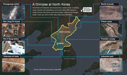 一名美国学生日前在网上建立了一张朝鲜地图。在无数网民的帮助下,朝鲜的许多道路,山川河流,大坝和军事核设施都一一揭开了自己神秘的面纱。连维基词典都在称赞网民的力量太过强大。
