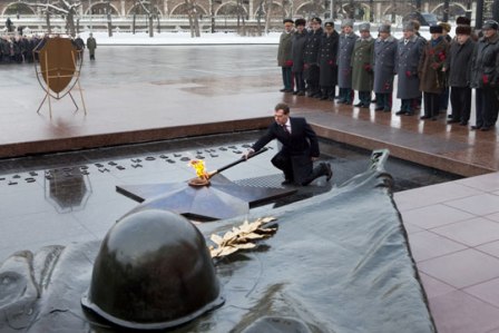 中新网2月24日电 据俄新网报道,俄罗斯总统梅德韦杰夫23日上午出席了隆重的纪念俄无名烈士的长明火“回迁”仪式,并亲自点燃长明火火种。