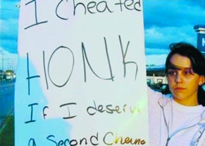 19岁的洁西·杜特瑞上周末站在一家超市的停车场外举着一块牌子,上面写着:“我曾对未婚夫不忠。如果你们认为可以再给我一次机会,请按一下喇叭。”牌子的另一面写着:“我真的很爱我的未婚夫。”