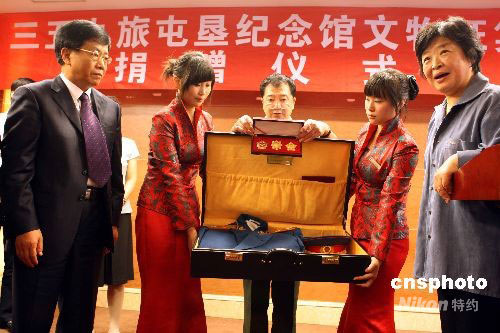 图为贺龙之女贺晓明(右)等在现场捐赠文物。