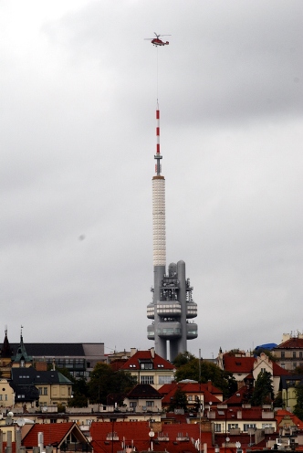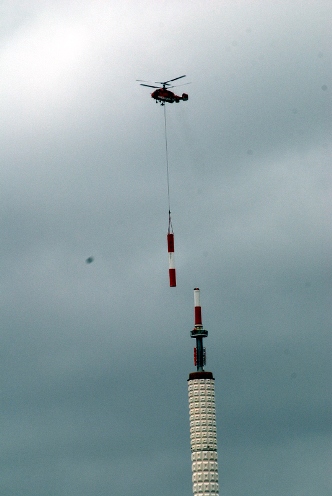 上午9时开始,瑞士一家专业公司的一架最大吊重5吨物体的俄罗斯卡莫夫KA-32型(Kamov KA-32 )直升机出现在阴云密布的布拉格上空,它首先起落3次运走拆卸下来的老天线,然后分两次成功吊装上高23米、重9吨的新天线。