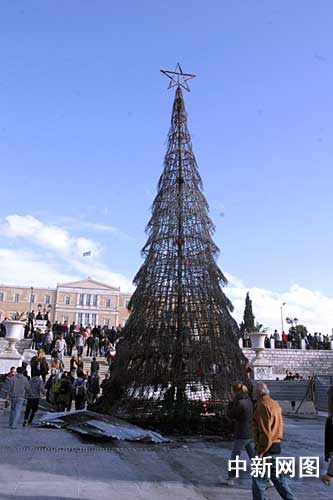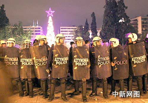 中新网1月2日电 据希腊《中希时报》报道,2009年元旦,在希腊首都雅典热闹繁华的宪法广场曾上演一场“圣诞树保卫战”。2009年1月1日的零时零分,新年钟声敲响,烟花腾空而起,在旧岁新年的交接时刻,希腊警察手持盾牌,严阵以待,列队在雅典宪法广场圣诞树前,保卫着一棵由彩灯和松枝扎制成的圣诞树。
