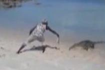 男子海滩上挑逗鳄鱼