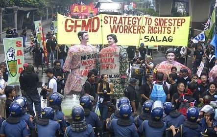 据悉,该次论坛从27日开始,将历时5天。示威者抗议政府举行该次会议,他们担心将使工人剥削合法化。当日,他们手举“难道他们希望移民只有草可以吃吗?”、“停止出口劳动力”以及“工人不是商品”等标语。警察当日在现场阻止抗议者接近会议中心。