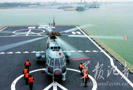 “50米、20米、10米……”舰载机越来越近,记者的心随之悬了起来。在飞行员的熟练操纵下,巨大的直升机以一个漂亮的三点着陆方式稳稳降落在“圆心”,地勤人员迅速上前,完成了固定、折翼、入库动作,首次联合舰机训练取得圆满的成功。