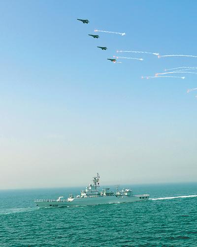 “绵阳”号导弹护卫舰在接受检阅,歼轰—7、歼—8等战机组成的空中梯队发射出红外干扰弹。