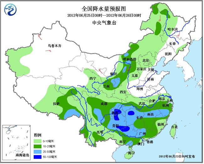 25日08时至26日08时,西藏东南部、西北地区东北部、内蒙古西部偏东地区和东北部、江南、华南大部、西南地区东部、云南西部和南部等地有中到大雨,其中,重庆南部、贵州东南部和东北部、广西东北部、湖南西北部等的局部地区有暴雨(50~80毫米);上述局部地区并伴有短时雷雨大风等强对流天气。