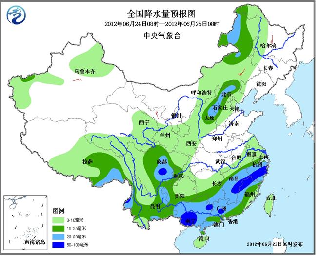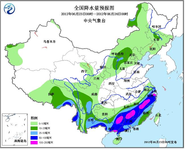 23日08时至24日08时,江南东部和南部、华南、云南东南部和西部、四川南部等地有大到暴雨,其中,广西南部沿海和东北部、广东西北部、湖南东南部、江西西南部和东北部、福建西北部以及浙江西南部和东北部等地的部分地区有大暴雨(100~150毫米)。另外,华北北部、内蒙古中部和东北部、吉林中部等地的部分地区有中雨,局地有大雨。华北西北部和东北部、西南地区东南部、华南西部、江南东北部局地有雷雨大风或冰雹天气。