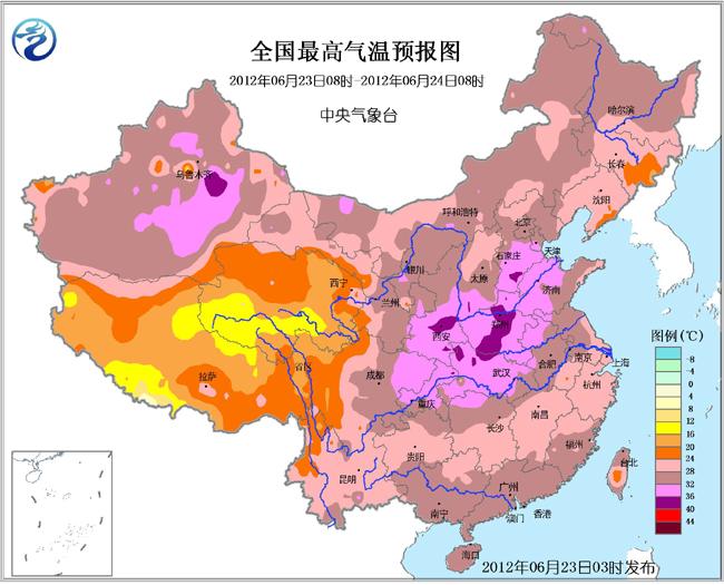23~24日,华北南部、黄淮中西部、陕西中南部、江汉北部及南疆盆地和吐鲁番盆地等地有35℃以上的高温天气,局地可达37~38℃。
