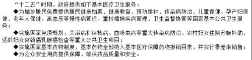 基本药物制度 城乡居民 享有零差率销售的基本药物,并全部纳入基本医疗保障药物报销目录,逐步提高实际报销水平 地方政府负责,中央财政适当补助 覆盖所有政府办基层医疗卫生机构和村卫生室