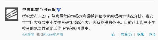 官方称雅安市中小学校舍破坏情况不大 可以复课