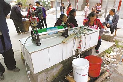 4月22日,芦山县龙门乡古城村武家坝组,村里安装了一个过滤水的仪器为村民提供饮用水。新京报记者 浦峰 摄