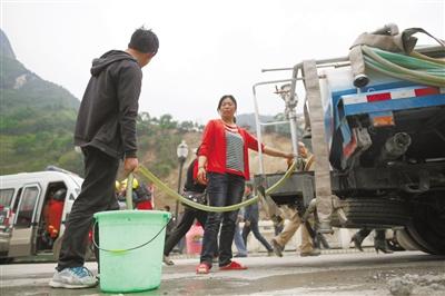 4月22日,宝兴县,灾民在应急供水车前打水。 新京报记者 侯少卿 摄