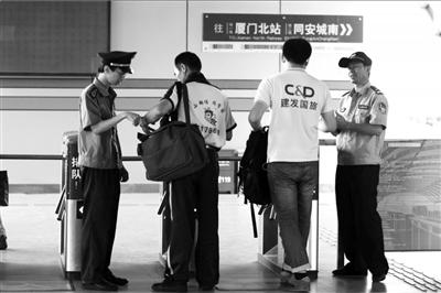 安全员在闸口对拎包乘客手检。潘之望 摄