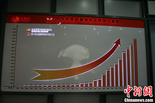 日照港1986年至2013年吞吐量增长及预测示意图,图中所示2013年的预测吞吐量为3.06亿吨。中新网 温雅琼摄
