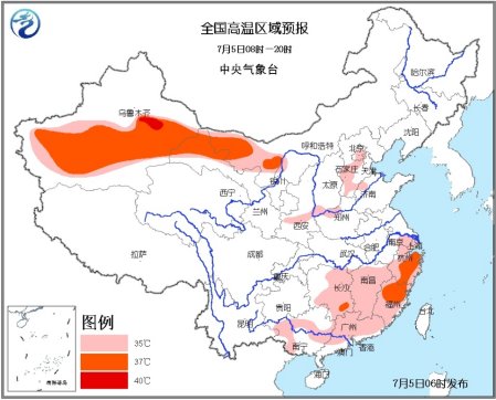 中央气象台继续发布高温蓝色预警,预计,5日白天,江南大部、华南大部、河北西南部、北京、陕西关中地区、河南西北部、内蒙古西部、甘肃西部和北部及南疆盆地等地有35℃以上的高温天气;其中,浙江东南部、福建北部、湖南南部、内蒙古西部、甘肃西北部及南疆盆地等地的部分地区最高气温可达37~39℃。