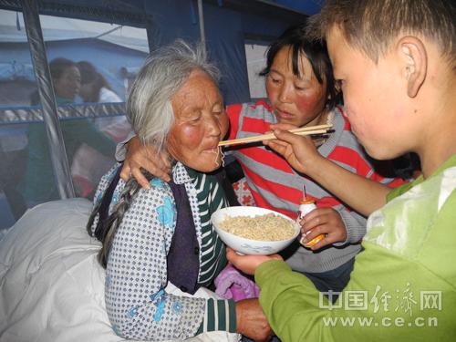 在定西“7·22”地震中,岷县梅川镇永光村70多岁的李改花老婆婆一家5口有4人遇难,年仅10岁的外孙子后智斌一夜间变成了“小大人”。他说自己要好好孝敬外婆,让外婆以后的日子过得幸福快乐。图为小后智斌在抗震棚里给外婆喂饭。(记者 黄俊毅 摄)