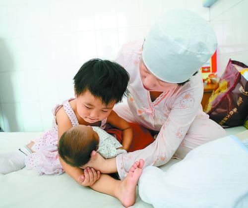 8月5日,陕西渭南,产妇董某和女儿共同抱起被解救男婴。母家亮/CFP