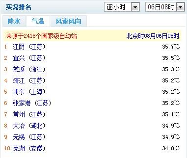 6日8时气温实况排名,江苏上海等地气温达35℃。(中央气象台网站截图)