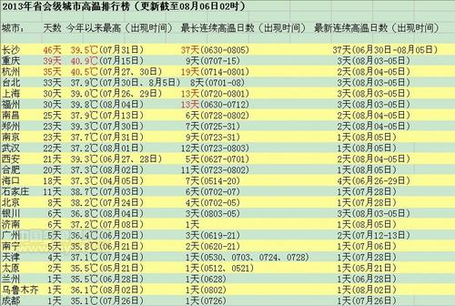 2013年省会级城市高温排行榜(更新截至8月6日02时)