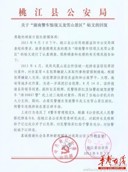 9月4日凌晨2时许,益阳市公安局、桃江县公安局分别致函湖南日报,通报桃江县公安局警车出现在丽江玉龙雪山停车场一事处理结果。对凤凰山派出所副所长吴程辉给予记过处分并免职,对民警陈彩红给予警告处分,对协警赵斌予以辞退。