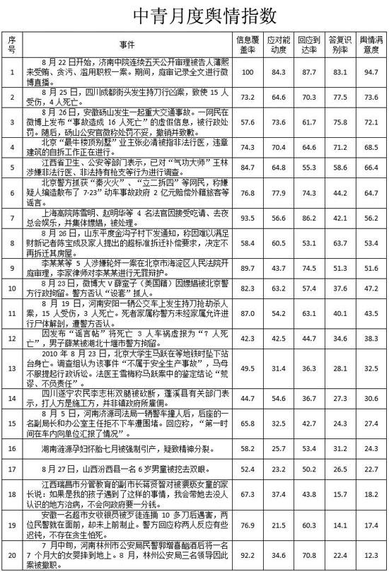 中青舆情监测室今日发布了第二期《中青月度舆情指数》。在8月的20件重大公共舆情事件中,政府的响应能力还处于“爬坡”阶段,但其中已经不乏优秀的案例。