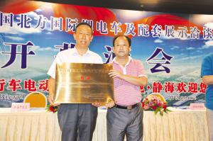 第三届中国北方国际锂电车及配套展示洽谈会开幕之际,中国自行车协会在天津滨海新区国际会展中心为“中国自行车电动自行车生产基地·静海”举行授牌仪式,标志着静海自行车电动车产业园升级为中国自行车电动自行车产业基地。市级老同志梁肃、国家工信部消费品司司长高延敏、中国机电产品进出口商会高级商务专员张培生到场祝贺。中国自行车协会副理事长兼秘书长郭文玉向静海经济开发区管委会授牌。县委书记冀国强致辞。静海县人大常委会副主任、县经济开发区党委书记张瑛接牌。副县长崔悦平致辞。