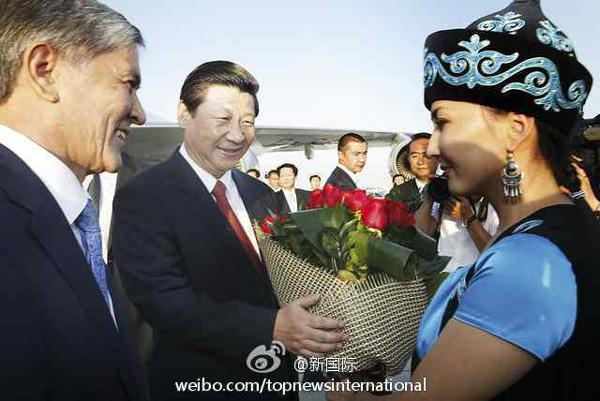 据新华社“新国际”微博报道,习主席10日来到中亚之行最后一站吉尔吉斯斯坦。余晖下的玛纳斯机场,国旗、国歌、红毯、礼兵、仪仗队,东道主阿坦巴耶夫总统欢迎中国客人。山水相连的中吉两国,迎来合作新机遇。上合峰会亦即将在此召开,习主席将同各成员国领导人共谋发展大计。