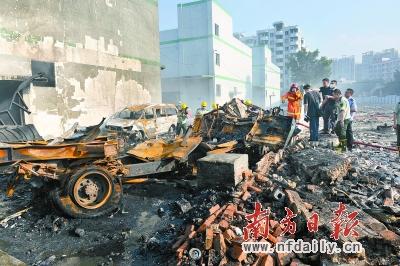 发生爆炸的仓库仍在冒烟,事发货车只剩个铁架。记者 黎湛均 梁炜培 谭庆驹