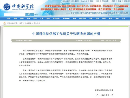 中新网9月11日电 据中科院网站消息,针对原铁道部运输局局长、副总工程师张曙光在法庭上供称,其受贿的部分钱财用于参评院士一事,中国科学院学部工作局11日晚发布声明回应称,张曙光曾于2007年和2009年被铁道部推荐为中科院院士候选人,两次均未当选。在其参选过程中,中科院未曾收到与张“花钱参评”的相关投诉。