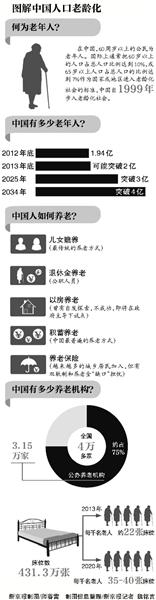《意见》将“如何养老”问题分解到民政部、国家发改委、财政部、国土资源部等多部委,要求新建居民小区按人均0.1平方米配建养老服务设施;要求医药结合,社区养老服务覆盖所有居家老人;要求全国社会养老床位数达到每千名老人35-40张,公办养老院必须先保障失能、失智、高龄或“三无”、低收入老人入住。