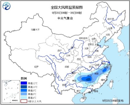 中新网9月25日电 据中央气象台网站消息,广西贵州湖南等地有中到大雨,未来24小时,江南、贵州东部、华南北部等地将有4~6℃降温,部分地区降温幅度可达8~10℃。