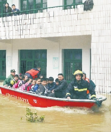 9月24日傍晚,满载小学生的冲锋舟从常德市鼎城区草坪镇中心小学被淹没的校园内驶出。