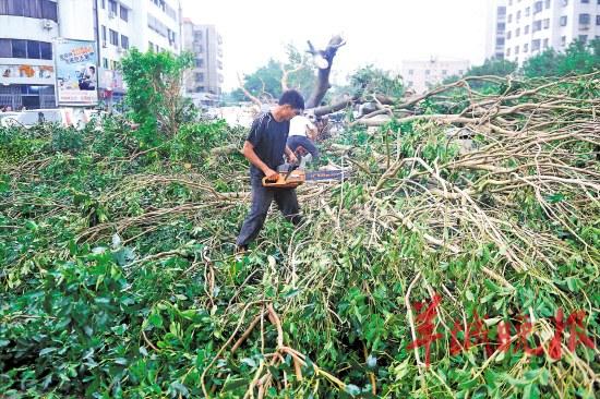 “天兔”过境后,汕尾市区大量树木被吹倒,市政工人在锯开树木清理路面 记者 周巍 摄