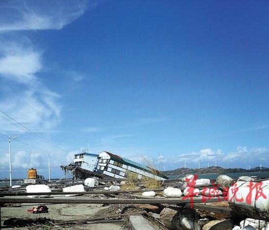 受“天兔”影响,汕尾红海湾一艘渔排被吹到了堤围上,水产养殖户损失严重