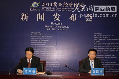 新闻发布会现场。欧亚经济论坛副秘书长、外交部欧亚司副司长苏方遒(左),欧亚经济论坛副秘书长、西安市副市长黄海清(右) 成苏宁/摄