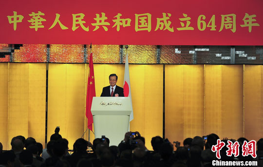 中新社东京9月26日电 (记者 孙冉)中国驻日本大使馆9月26日在东京新大谷酒店举行了国庆64周年招待会。驻日大使程永华发表讲话称,中国政府愿在中日四个政治文件基础上,继续推进中日战略互惠关系。望日方拿出政治决断和智慧,推动中日关系重回正常发展轨道。
