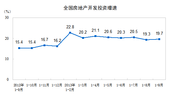 统计局通报数据显示,2013年1-9月份,全国房地产开发投资61120亿元,同比名义增长19.7%(扣除价格因素实际增长19.7%),增速比1-8月份提高0.4个百分点。其中,住宅投资41979亿元,增长19.5%,增速提高0.3个百分点,占房地产开发投资的比重为68.7%。