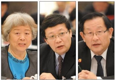 昨日,全国人大常委会专题询问“国家财政科技资金分配与使用情况”,全国人大常委会委员吴晓灵(左)等提问,财政部部长楼继伟(中)、科技部部长万钢(右)等部委负责人回答。图片来源:中国人大网