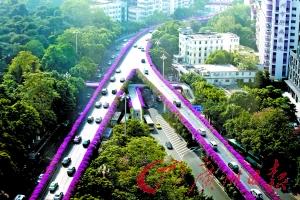 开花的“人” 昨日,东风路上,簕杜鹃花盛放在道路两旁,竞艳广州城。人字形的高架路两旁繁花似锦,“写”出了一个开满鲜花的“人”字。记者高鹤涛 摄