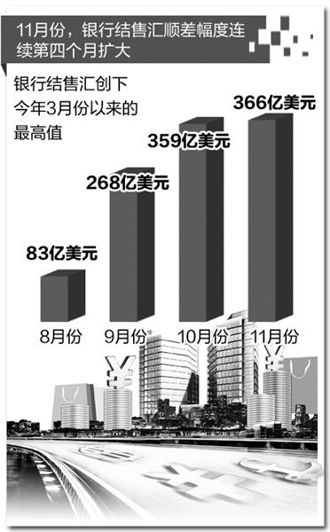 今年以来,我国银行结售汇数据顺差和逆差交替出现。6月份,受到我国经济增速放缓和美国退出量化宽松货币政策呼声渐高影响,银行结售汇结束前5月的顺差,连续出现两个月的逆差。8月份,以83亿元的顺差额扭转局面,随后持续扩大为268亿美元、359亿美元,再到11月的366亿美元,创下今年3月份以来的最高值。