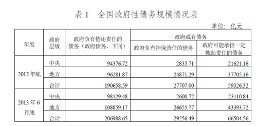 截至2013 年6 月底,中央政府负有偿还责任的债务98 129.48亿元,负有担保责任的债务2600.72 亿元,可能承担一定救助责任的债务23 110.84 亿元。具体构成是: