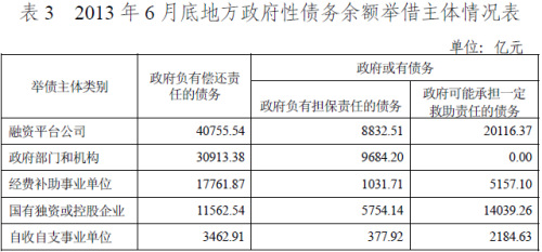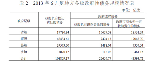 截至2013年6月底,地方政府负有偿还责任的债务108 859.17亿元,负有担保责任的债务26 655.77 亿元,可能承担一定救助责任的债务43 393.72 亿元。根据近年来地方政府性债务在举债主体和融资方式上出现的新情况,本次审计,在政府负有担保责任的债务中,包括了全额拨款事业单位为其他单位提供担保形成的债务383.52 亿元;在政府可能承担一定救助责任的债务中,包括了地方政府通过国有独资或控股企业、自收自支事业单位等新的举债主体和通过BT(建设-移交)、融资租赁、垫资施工等新的举债方式为公益性项目举借,且由非财政资金偿还的债务19 730.13亿元。地方政府性债务具体情况是: