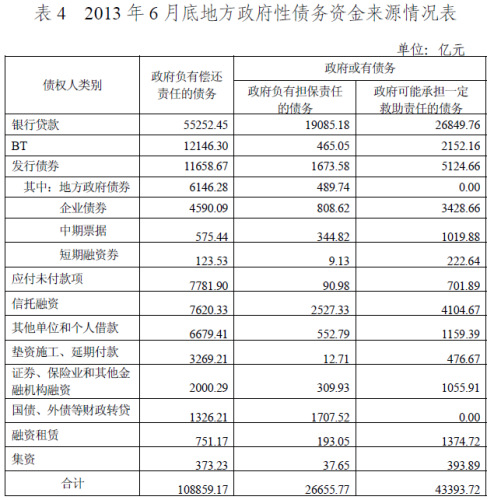 ——从债务资金来源看,银行贷款、BT、发行债券是政府负有偿还责任债务的主要来源,分别为55 252.45 亿元、12 146.30亿元和11 658.67 亿元(详见表4)。