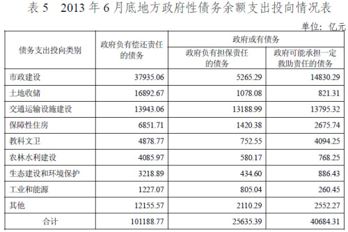 ——从债务资金投向看,主要用于基础设施建设和公益性项目,不仅较好地保障了地方经济社会发展的资金需要,推动了民生改善和社会事业发展,而且形成了大量优质资产,大多有经营收入作为偿债来源。在已支出的政府负有偿还责任的债务101 188.77 亿元中,用于市政建设、土地收储、交通运输、保障性住房、教科文卫、农林水利、生态建设等基础性、公益性项目的支出87 806.13 亿元,占86.77%(详见表5)。其中,用于土地收储债务形成大量土地储备资产,审计抽查的34 个重点城市2本级截至2013 年6 月底储备土地16.02 万公顷;用于城市轨道交通、水热电气等市政建设和高速公路、铁路、机场等交通运输设施建设的债务,不仅形成了相应资产,而且大多有较好的经营性收入;用于公租房、廉租房、经济适用房等保障性住房的债务,也有相应的资产、租金和售房收入。