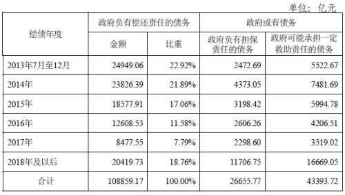 ——从未来偿债年度看,2013 年7 月至12 月、2014 年到期需偿还的政府负有偿还责任债务分别占22.92%3和21.89%,2015年、2016 年和2017 年到期需偿还的分别占17.06%、11.58%和7.79%,2018 年及以后到期需偿还的占18.76%(详见表6)。