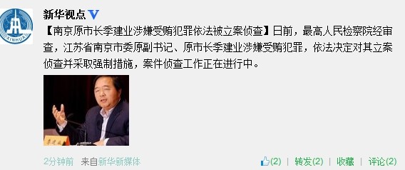 中新网2月7日电 据新华社新华视点官方微博消息,日前,最高人民检察院经审查,江苏省南京市委原副书记、原市长季建业涉嫌受贿犯罪,依法决定对其立案侦查并采取强制措施,案件侦查工作正在进行中。